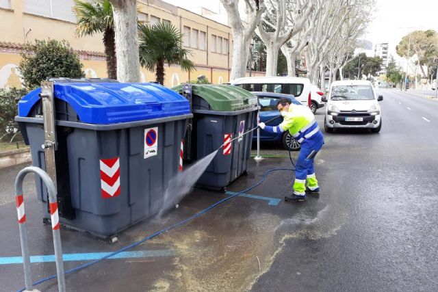 El Ayuntamiento de Cartagena empezó el sábado una campaña especial de limpieza con desinfectante de contenedores y elementos utilizados en la recogida de basuras, además de bancos y otros elementos del mobiliario urbano. Los trabajos, que está realizando la concesionaria Lhicarsa, se ejecutan preferentemente mediante la limpieza a chorro con jabones desinfectantes y se extenderán durante el tiempo que dure la crisis sanitaria, según ha informado la concejal de Infraestructuras, María Casajús.