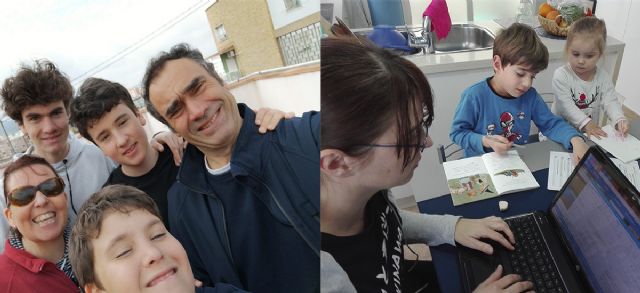 Los cinco tienen las mañanas atareadas. Esta familia precisa recursos  tecnológicos para sacar adelante el trabajo y el estudio telemático.  «Rosa, mi mujer, que es profesora de instituto, y yo damos clase por  la mañana a través de plataformas virtuales. Yo con Teams y ella con  Meet».