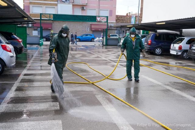 125 efectivos de la Unidad de Defensa contra Incendios Forestales distribuidos en 15 brigadas, se han incorporado este jueves 26 al dispositivo especial de limpieza y desinfección que el Ayuntamiento de Cartagena está realizando en espacios públicos para evitar el riesgo de contagios y garantizar la seguridad de los ciudadanos.