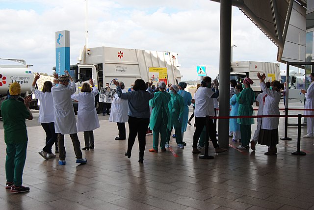 Trabajadores del servicio municipal de recogida de basura, limpieza viaria y planta de tratamiento de R.S.U, pertenecientes a LHICARSA, así como trabajadores de FCC MEDIO Ambiente, que prestan sus servicios en la contrata de Limpieza de Edificios Municipales y Limpieza de Colegios, a los que se ha unido también el servicio que la empresa presta de Limpieza Industriales, han brindado un emotivo y caluroso aplauso en el día de hoy, a los médicos, enfermeros, enfermeras y resto de personal sanitario, que trabajan en el Hospital General Universitario de Cartagena, donde con este acto, han querido mostrar su más profundo agradecimiento a estos profesionales por la labor y gran profesionalidad que que están llevando a cabo, con motivo del COVID-19.