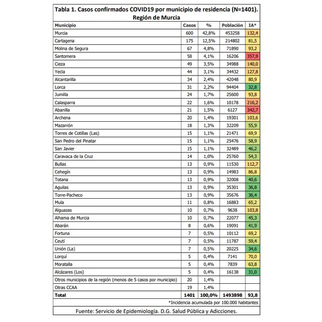 En la Región de Murcia hasta la fecha del informe se han registrado 1463 casos confirmados de infección por COVID-19. El primer caso se declaró el 6 de marzo y se confirmó como positivo el 8 de marzo.