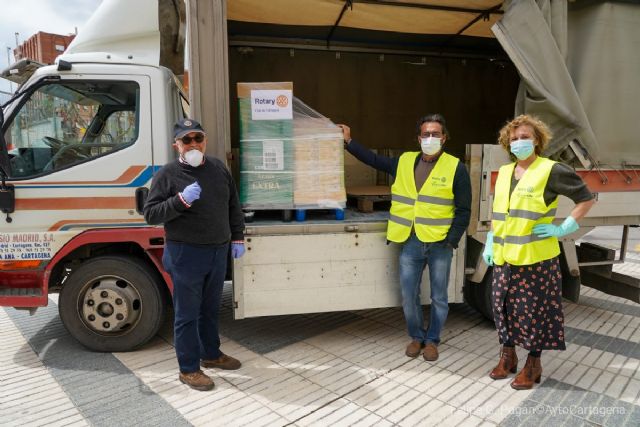 Miembros del Rotary Club de Cartagena, encabezados por su presidente, Juan Martínez Pagán, volvían esta mañana a colaborar con el operativo de emergencia municipal del coronavirus establecido por diferentes servicios municipales y coordinados por el área de Bienestar Social y de Deportes, que dirige la vicealcaldesa, Noelia Arroyo.