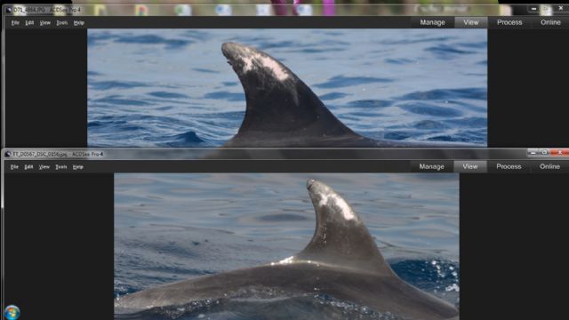 Fotos: Animales en el interior de la almadraba (P.García/ANSE), y aletas del catálogo de delfines mulares de ANSE con el individuo TT_D0567 en 2014 y en el día de ayer