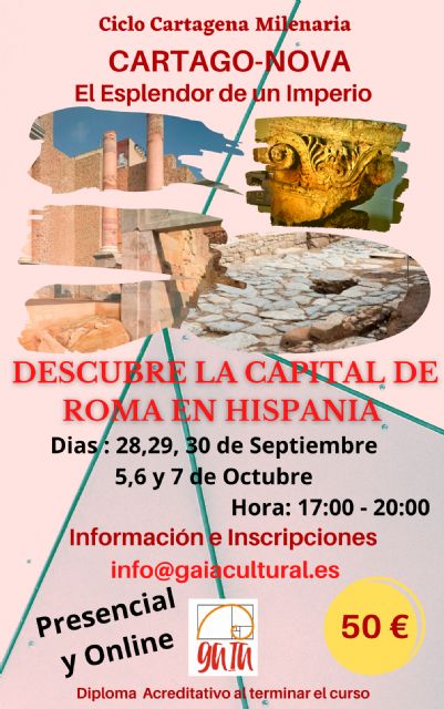 Gaia Cultural presenta ante el gran éxito de anteriores convocatorias un nuevo ciclo formativo sobre la Historia de Cartagena. Enmarcado en las jornadas "Cartagena Milenaria", en esta ocasión se centra en la ciudad de Caratgo Nova, donde descubrirás el pasado glorioso de la ciudad que fue la capital de Hispania durante el imperio romano. Las tasas son 50 € y se incluye acceso a las charlas (presencial u online), documentación, carpeta virtual, actividades prácticas y diploma con certificado de aprovechamiento.