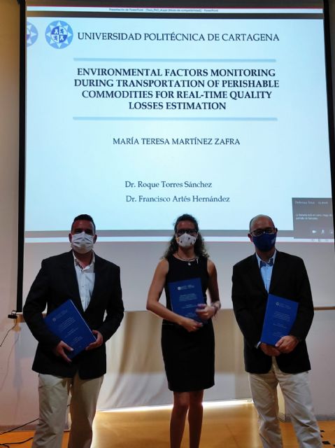 La tesis con la que se ha doctorado en la UPCT María Teresa Martínez Zafra está centrada en el análisis del comportamiento de productos hortofrutícolas ante condiciones no recomendadas de conservación y transporte refrigerado y en el desarrollo de sistemas de monitorización inteligentes de las principales variables que afectan a su vida comercial.