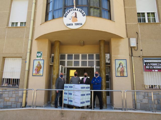 Andrés Martínez Gumbau, gerente de Hidrogea en Cartagena, acompañado de un representante de la plantilla, hizo entrega de los lotes a Alonso Gómez y Domingo Segado, quienes asistieron por parte de la Hospitalidad de Santa Teresa.