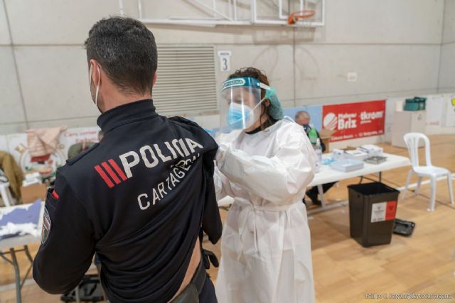 El pabellón municipal de Cabezo Beaza ha acogido este martes, 23 de febrero, la vacunación de más de 800 personas. Se trata del primer grupo de vacunación de personal municipal que desempeña labores de seguridad.