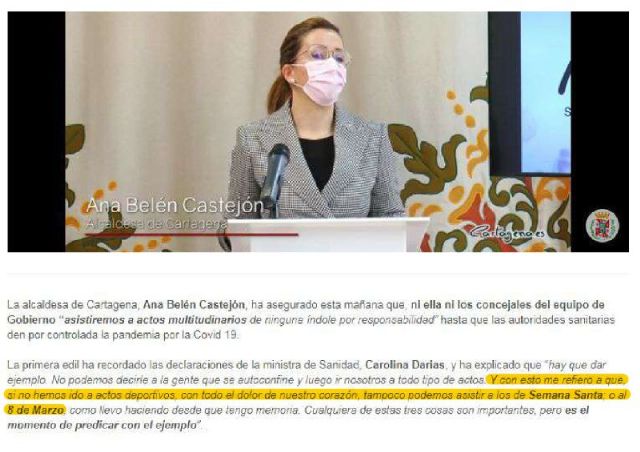 "No asistiremos a actos multitudinariosde ninguna índole por responsabilidad. Son palabras textuales de la alcaldesa, Ana Belén Castejón, el pasado viernes. Para mayor ahondamiento, precisaba que igual que no hemos acudido a actos deportivos no podemos hacerlo con los de Semana Santa. Menos de 24 horas después, su segunda, Noelia Arroyo acudía al partido de fútbol sala que congregó en el Palacio de los Deportes a mil espectadores". Así ha comenzado explicando Soler el último esperpento del Ejecutivo local.