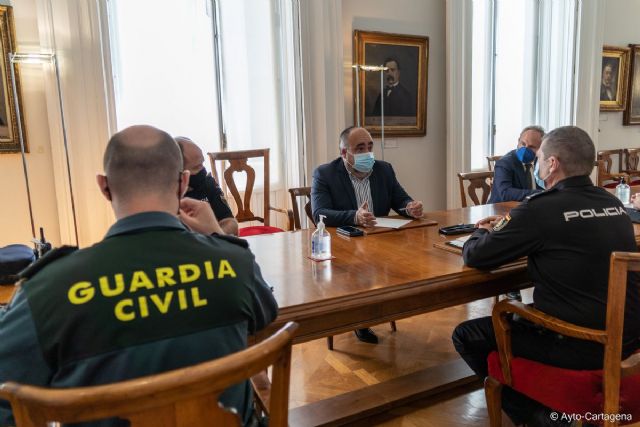 El concejal de Seguridad Ciudadana, Juan Pedro Torralba, ha mantenido esta mañana una reunión de coordinación para diseñar el dispositivo de seguridad de cara al próximo fin de semana y sucesivos. En el encuentro han estado también presentes el inspector jefe de la Policía Local de Cartagena, Pedro Moreno; el responsable de Seguridad de la Autoridad Portuaria, Francisco Muñoz; el capitán jefe de la IV Compañía de la Guardia Civil de Torre Pacheco, Manuel Gil Rozas; y el inspector de la Policía Nacional Juan Antonio Turégano.