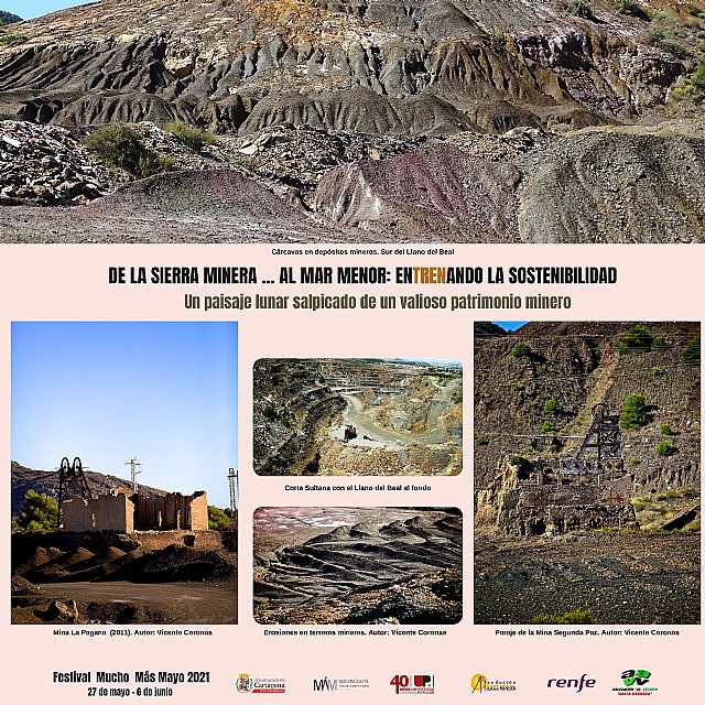 El Ayuntamiento de Cartagena y Renfe presentan este viernes 28 de mayo a las 19:00h, en la estación de Cartagena, la exposición fotográfica 'De la Sierra Minera…..al Mar Menor: entrenando la sostenibilidad', en las estaciones y trenes de la línea Cartagena- Los Nietos. La exposición en las estaciones consta de 12 fotografías en la estación de Cartagena y carteles con 25 imágenes en diversos apeaderos de la línea. En cada uno de los trenes se colocarán 4 fotografías sobre patrimonio y paisajes mineros.