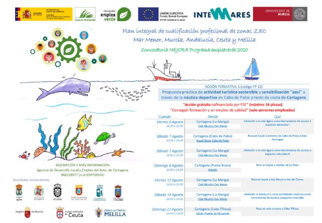 Esta acción formativa, incluida en el Programa Emplea Verde con el que colabora el Ayuntamiento de Cartagena, tiene por objeto mejorar las competencias profesionales de los trabajadores en las zonas costeras. El número máximo de plazas es de 16 y entre las actividades a realizar destacan rutas en vela y kayac, e iniciación a deportes náuticos, entre otras. El curso se desarrollará del 6 al 22 de agosto, en La Manga, Cabo de Palos, Los Urrutias y Cabo Tiñoso.