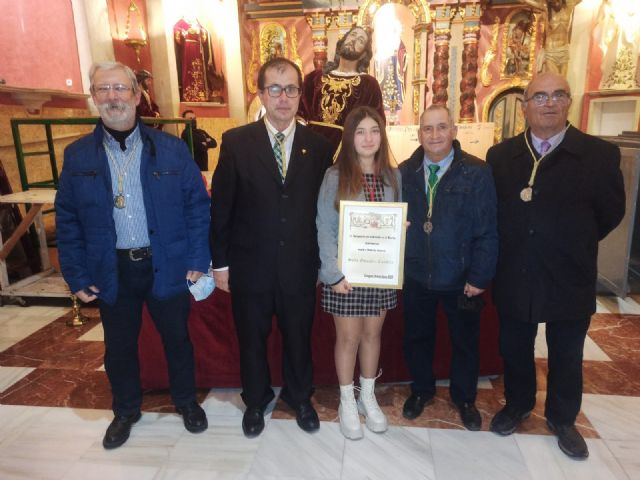 (En la fotografía, adjunta a este documento, de izquierda a derecha, el capellán de la Cofradía California, Francisco de Asís Pagán Jiménez; el presidente de la Agrupación de la Oración en el Huerto, Francisco López Fidel; la madrina del tercio infantil, Sofía González Candela; y el hermano mayor de la Cofradía California, Juan Carlos de la Cerra Martínez, en el momento de la entrega del cuadro conmemorativo en el altar mayor de la Iglesia de Santa María de Gracia).