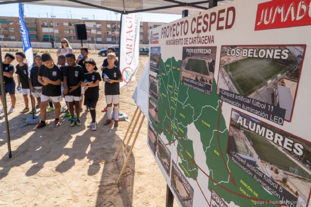 Las primeras actuaciones ya están en marcha. El Plan Césped ya se ha activado en cuatro instalaciones de forma simultánea para eliminar definitivamente la tierra de todos los campos de fútbol municipales. Una inversión de 3,5 millones de euros para convertir a césped 12 campos de fútbol en un total de diez emplazamientos. Las cuatro primeras actuaciones se están desarrollando en Urbanización Mediterráneo, Los Belones, Gómez Meseguer y Mundial 82.