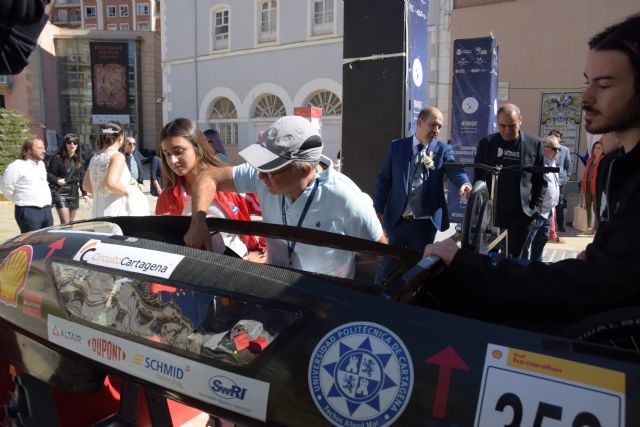 “Fui uno de los alumnos que fundaron el UPCT Solar Team”, ha explicado Manuel Pérez, quien se ha acercado hasta el ‘stand’ de este equipo de competición de la Politécnica de Cartagena junto a su esposa y vestidos de novios, pues se estaban haciendo las fotos de boda en la plaza del Ayuntamiento.
