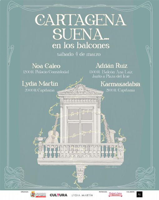 El proyecto ‘Cartagena suena… en los balcones’, creado por la cantante y periodista local Lydia Martín con la colaboración de la Concejalía de Cultura del Ayuntamiento de Cartagena, comenzará a las 12:00 horas en el balcón del Palacio Consistorial con la música de Noa Caleo para desplazarse, una hora después, al balcón de Ana Laiz Asesores, junto a la Plaza del Icue, con la actuación de Adrián Ruiz.