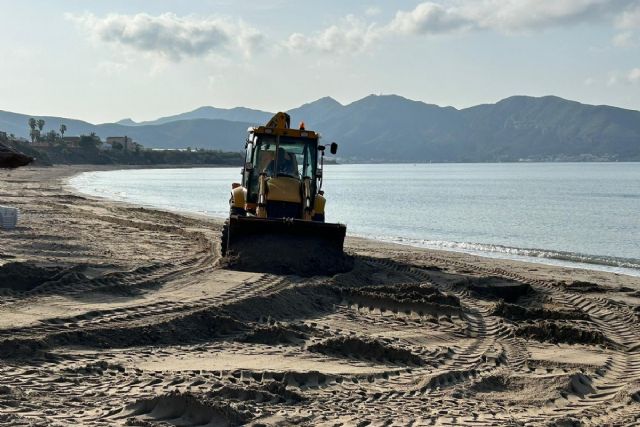 Media docena de tractores y cuarenta personas desplegadas forman el dispositivo coordinado por el Ayuntamiento de Cartagena para reparar los daños producidos en las playas del municipio debido a las intensas lluvias del pasado martes.