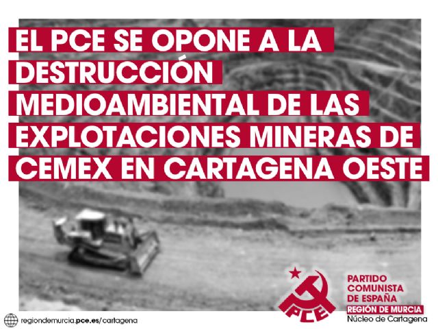 Cartagena, 5 de Septiembre, 2023 - Debido a las noticias conocidas en las últimas semanas sobre la posible extracción de materiales puzolánicos en la zona oeste de Cartagena, por parte de la multinacional CEMEX, la formación del Partido Comunista en la ciudad portuaria han declarado en redes sociales que "estos hechos nos muestran la necesidad del capitalismo de explorar nuevas zonas de reservas de recursos naturales ante un planeta finito, que como la clase obrera, se encuentra sometido a la ampliación incesante de ganancias para unos pocos, mientras que las mayorías sociales están cada día más precarizadas".