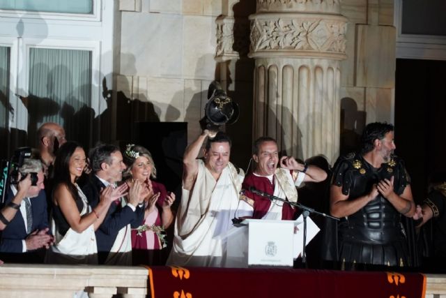 Cartagena inició este viernes diez días de fiesta con el pregón de los televisivos Tomás Roncero y Cristóbal Soria. Los tertulianos de El Chiringuito de Jugones arengaron desde el balcón del Palacio Consistorial a las tropas y legiones que dan vida a la fiesta más importante del Mediterráneo: Carthagineses y Romanos. La alcaldesa, Noelia Arroyo, precedió el pregón recordando que “esta gran ciudad ha crecido sobre una gran historia milenaria, que se revive gracias a los festeros que hacen grande a Cartagena”.