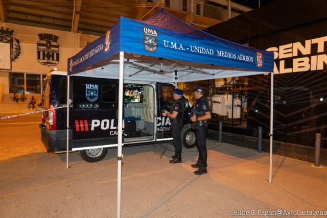 La Policía Local de Cartagena cuenta con uso de drones. Y, por primera vez en unas fiestas de Carthaguineses y Romanos, tiene en servicio una unidad específica preparada en el control de masas. Se trata del Grupo Operativo Especial de Seguridad Ciudadana (GOESC), cuyos agentes van ataviados con boinas y equipamiento táctico.