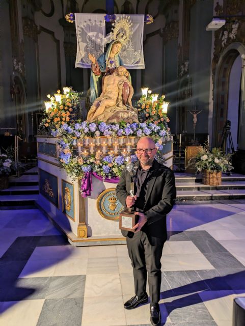 El concejal del Área de patrimonio y Vivienda del Ayuntamiento de Cartagena, Pablo Braquehais; el Hermano Mayor marrajo, Francisco Pagán y el presidente de la Agrupación de Portapasos Promesas de la Stma. Virgen de La Piedad, José Jesús Guillén, han entregado al lucentino este primer premio dotado con 3.000 euros, con un trofeo-escultura realizado por el escultor Fernando Saénz de Elorrieta y diploma.