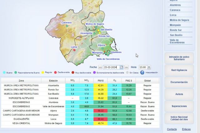 Ayer, 23 de marzo, se ha registrado el Nivel 1 (preventivo) para las PARTÍCULAS en la estación de medida de La Aljorra, perteneciente a la zona de calidad del aire "Litoral-Mar Menor".