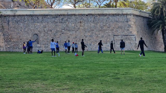 Además, la formación verde ha recibido fotos de los inmigrantes jugando al fútbol y `peloteando´ en el tramo de la muralla de Carlos III situada en la Cuesta de El Batel, con una portería pintada en la misma.