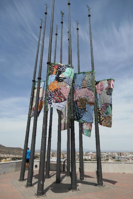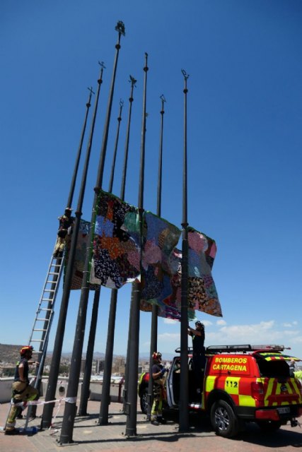 Las banderas fueron confeccionadas de forma colaborativa, en el Taller de Costura Creativa de la Universidad Popular de Cartagena, con costureras que participaron en el proyecto de forma voluntaria. El material textil fue proporcionado por el Proyecto Abraham de Murcia, asociación que trabaja por una sociedad más justa, solidaria y sostenible, a través de diversas actividades vinculadas a la gestión integral de los residuos.