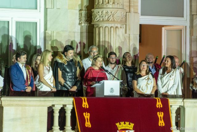 La alcaldesa Noelia Arroyo ha introducido el pregón ofrecido desde el balcón del Palacio Consistorial por los jugadores meloneros Chispi, Waltinho, Pablo Ramírez, el entrenador Duda y el presidente Miguel Ángel Jiménez. La regidora ha recalcado a tropas y legiones que podrán seguir celebrando las fiestas en próximos años en el actual emplazamiento del campamento festero, situado junto al estadio Cartagonova: "Será vuestro campamento durante todo el tiempo que queráis". Y ha ensalzado la gesta de los guerreros del Jimbee, "que han ganado grandes batallas y llevan lejos el nombre de Cartagena". El equipo de fútbol sala es el vigente campeón de la liga española y esta temporada competirá en la UEFA Futsal Champions League.