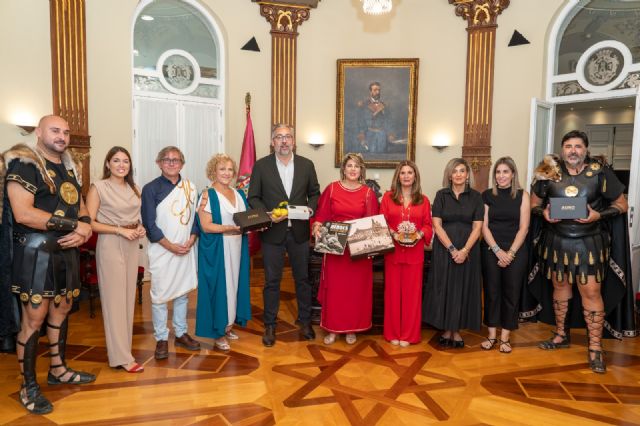 La alcaldesa de Cartagena, Noelia Arroyo, ha ofrecido una recepción a la regidora del Ayuntamiento de Linares, Auxi del Olmo, y al alcalde de Santomera Víctor Martínez, en la última jornada de esta edición de las Fiestas de Carthagineses y Romanos, en la que ambos municipios han tenido especial protagonismo, al ser punto de partida del Fuego Sagrado.