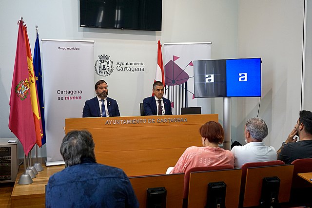 El portavoz de MC Cartagena, Jesús Giménez Gallo, junto al concejal cartagenerista, Juan José López Escolar, han comparecido esta mañana en rueda de prensa para tratar las similitudes de la marca de 'La Gran Cartagena' con la identidad visual de un museo australiano, concretamente el Centro Australiano para la Imagen en Movimiento.