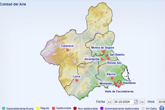 En cuanto a los niveles de calidad de aire detectados, el promedio diario de partículas PM10 detectado ayer en las estaciones medidoras fue de 65.06 µg/m3 en Alumbres, 69.65 µg/m3 en Valle de Escombreras, y 77.83 µg/m3 en Mompeán (casco urbano). La evolución de la calidad del aire se puede seguir en tiempo real a través de la página sinqlair.carm.es/calidadaire.
