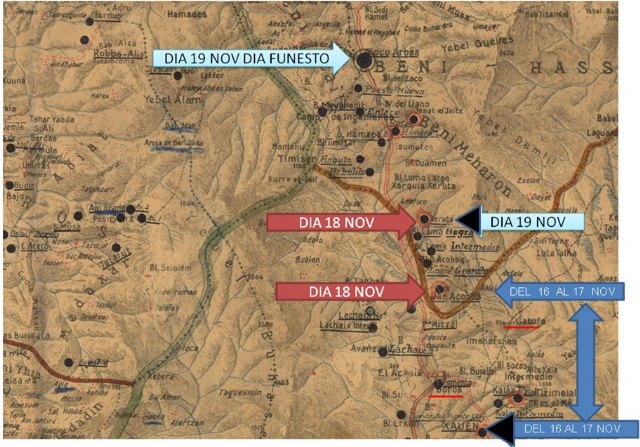 En el plano de arriba se resumen los tres primeros días de la operación, que no deja de ser una retirada, con lo que esta palabra significa, es la maniobra más difícil de las que se pueden presentar en el campo batalla. Todo los mandos temían que se repitiera lo sucedido en Annual, pero las unidades estaban muy bien instruidas y se pegaron al terreno, habiendo en la retirada unos 2.000 muertos.