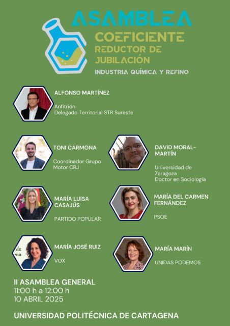 El Grupo Motor por el Coeficiente Reductor del Jubilación (CRJ) para los trabajadores de la industria química y el refino va a celebrar en Cartagena su II Asamblea Nacional. Un encuentro en que se darán cita 150 personas y que se celebrará el mañana jueves 10 de abril en el salón de actos de la Escuela Técnica Superior de Ingeniería Agronómica de la UPCT, sito en el paseo Alfonso XIII.