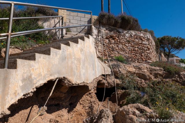 El Ayuntamiento de Cartagena ha comenzado, como adelantó la alcaldesa, Noelia Arroyo, el pasado mes de marzo, la reconstrucción de la escalera de Poniente del Portús, que conecta la playa con las viviendas y aparcamientos superiores, y que sufría un deterioro significativo agravado por los últimos temporales y las escorrentías en la ladera del monte.