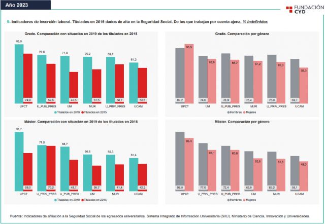 Los datos de afiliación a la Seguridad Social en 2023 de quienes completaron grados en 2019 muestran que el 89% de quienes lo hicieron en la UPCT tienen contratos indefinidos, frente a la media del 70% en el conjunto de graduados en universidades de la Región. Y la ratio se eleva al 92% para quienes hicieron másteres en la Politécnica y únicamente al 76% en la media regional.