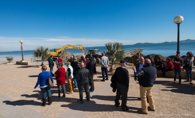 El alcalde y la vicealcaldesa, junto con los vecinos y otros miembros de la Corporación municipal, han celebrado el comienzo de las obras en la playa como primer paso para salvar el Mar Menor